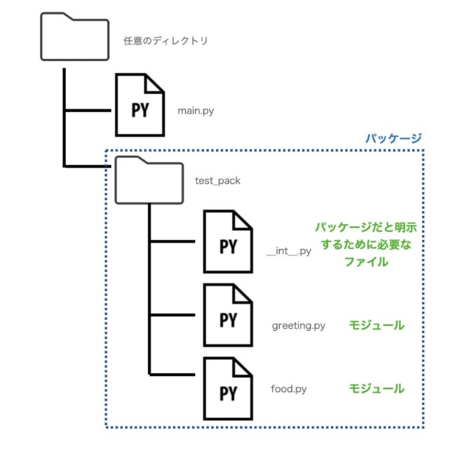 | .py ファイル | パッケージ内のモジュール これらがパッケージの具体的な機能を提供する |