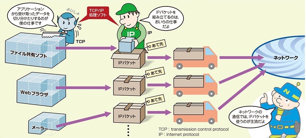 ・データ(荷物の中身) などが詰め込まれていて、インターネットを通って相手に届きます。