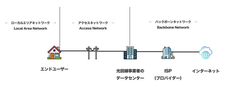 光ファイバーや海底ケーブルなどのインフラを敷設・維持しており、自宅〜ISPまでの「光ファイバーという道路」を提供しています。