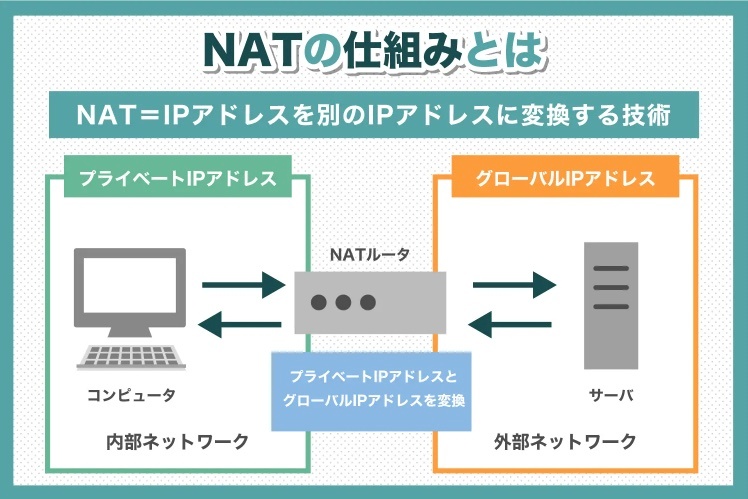 NAT(Network Address Translation:ネットワークアドレス変換)は、プライベートIPアドレスとグローバルIPアドレスを相互に変換する技術です。