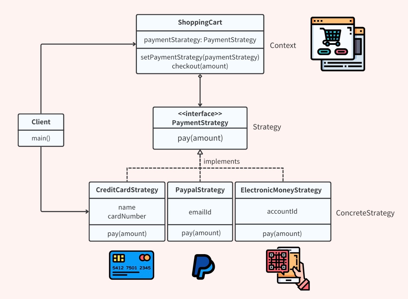 具体的には、ストラテジーパターンを使用すると、特定のタスクを実行するための複数のアルゴリズムや方法を、同一のインターフェースまたは抽象クラスにカプセル化して定義する。クライアントは、このインターフェースまたは抽象クラスを通じてアルゴリズムを利用するため、アルゴリズムの内部実装に依存することなく、同じ方法でタスクを実行することができる。