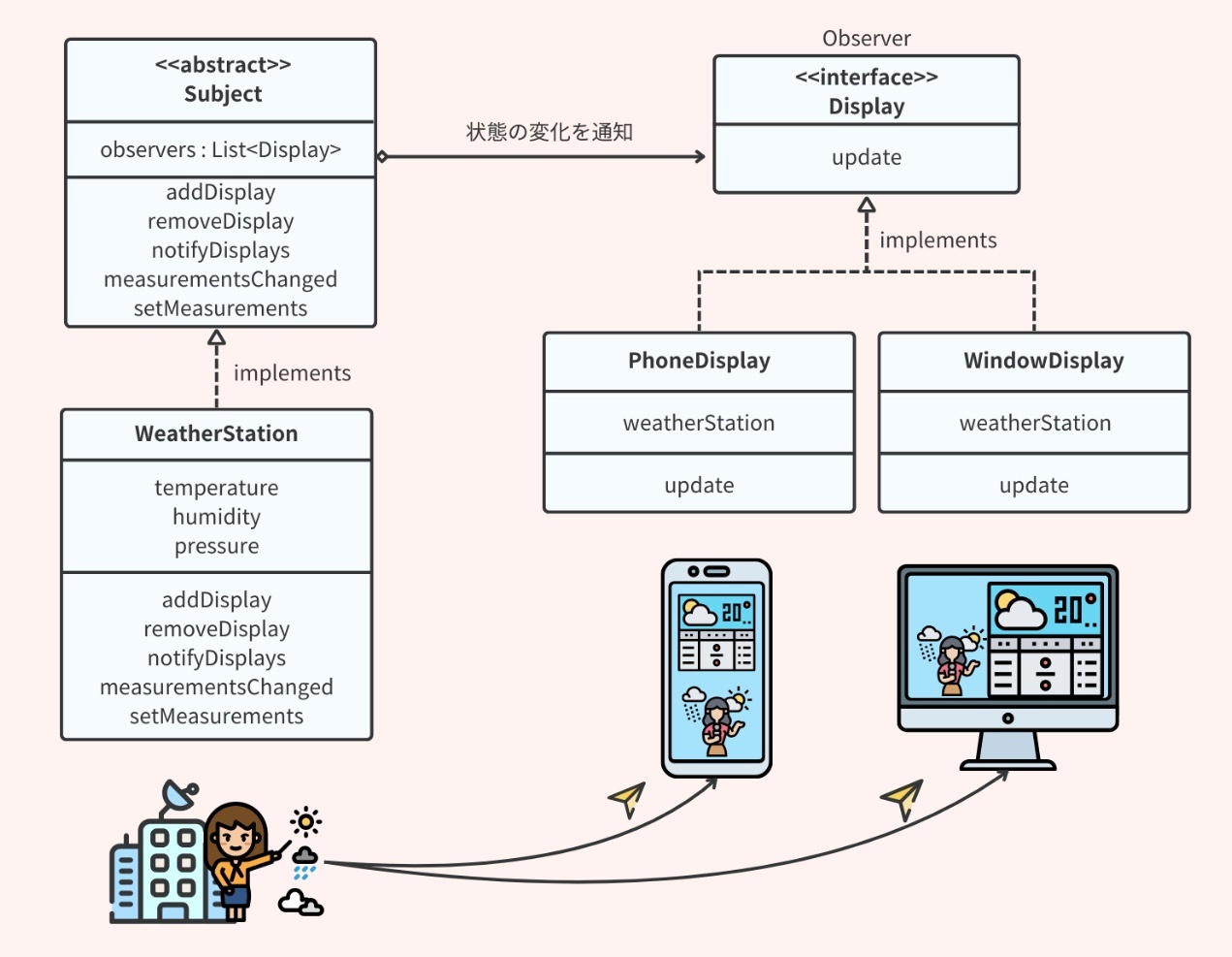 このパターンは、オブジェクトの状態の変化を他のオブジェクトに効率的に伝える必要がある場合、特にリアルタイムでの更新が求められる場合に有効。これにより、システム内のオブジェクトが互いに密に結びつくことなく、状態の変更を効率的に管理と共有することができる。