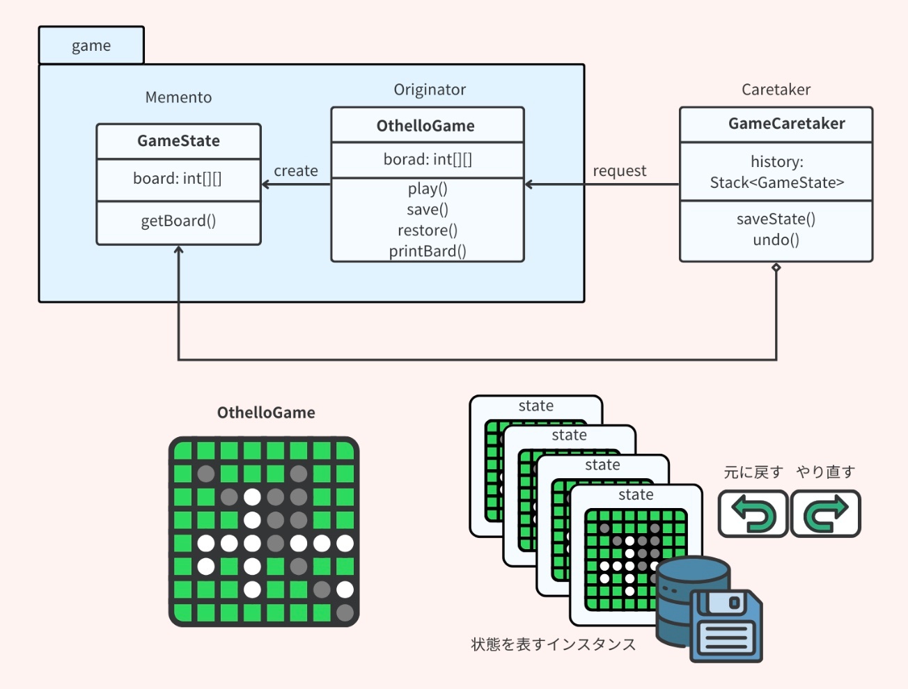 このパターンは、元に戻す・やり直す機能の実装や、オブジェクトの状態を特定のポイントでチェックして、状態の変更やエラーから復元する必要がある場合によく使われる。