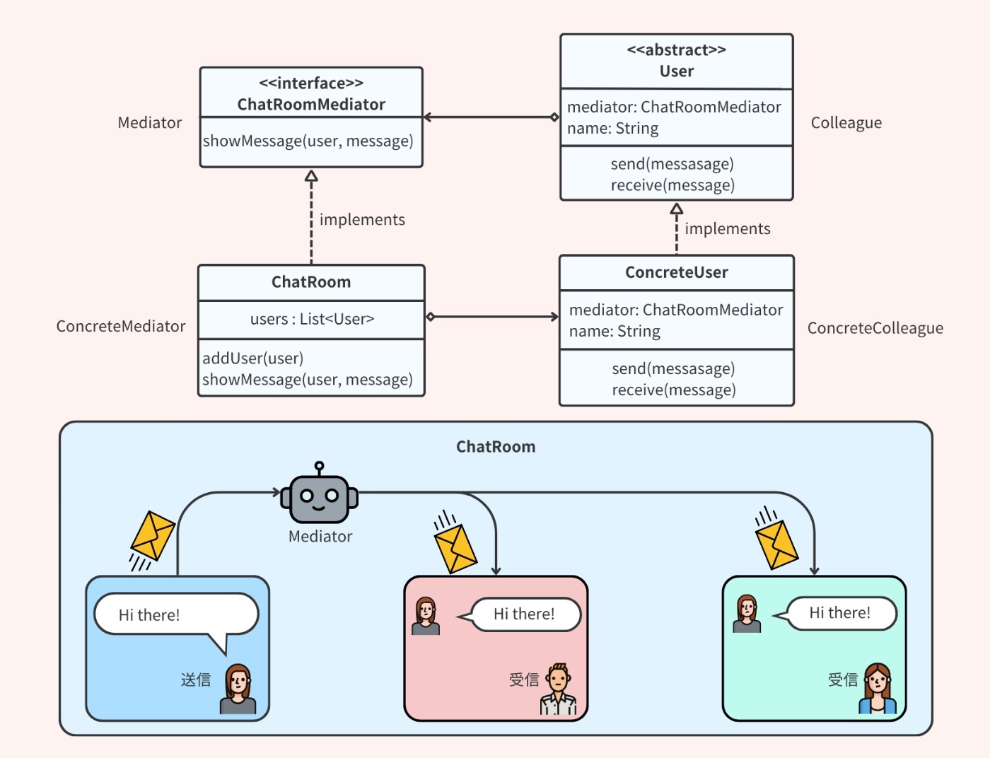 メディエータと呼ばれるオブジェクトを定義し、他のオブジェクト同士のコミュニケーションの仲介役として動作させるもの。オブジェクト同士が直接コミュニケーションを行なうのではなく、メディエータにメッセージを送り、メディエータが適切なオブジェクトまたはオブジェクトにメッセージを転送する。