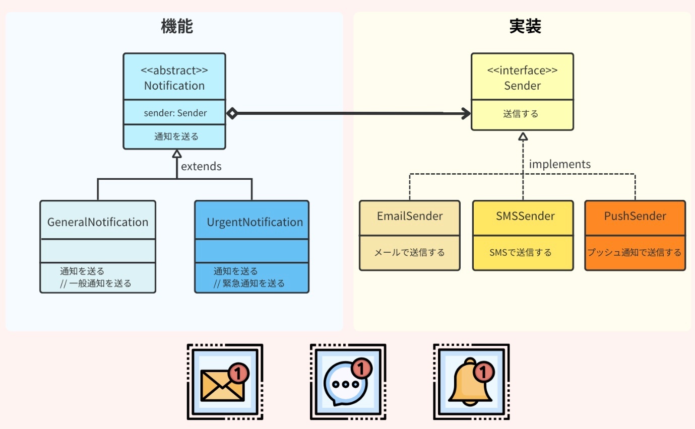 具体的には、あるクラスの機能やロジック(抽象化)と、それを具体的に実行する方法(実装)が密接に結びついていると、一方を変更した際に他方に影響を与えてしまう可能性がある。これを防ぐため、ブリッジパターンを用いて抽象化と実装を分けることで、それぞれを独立に変更や拡張ができる構造を目指す。