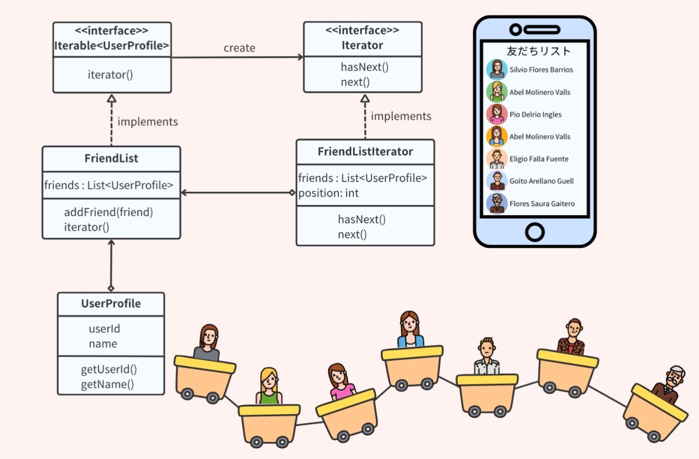 コレクションの要素に順番にアクセスする方法を提供し、その基礎となる実装を公開せずに済むようにする。イテレータパターンを使用すると、コレクションの内部構造を知らなくても、その要素を効率的に探索できる。これは、配列、リスト、木構造など、さまざまなデータ構造に対して同じインターフェースでアクセスできるようにするためのパターン。