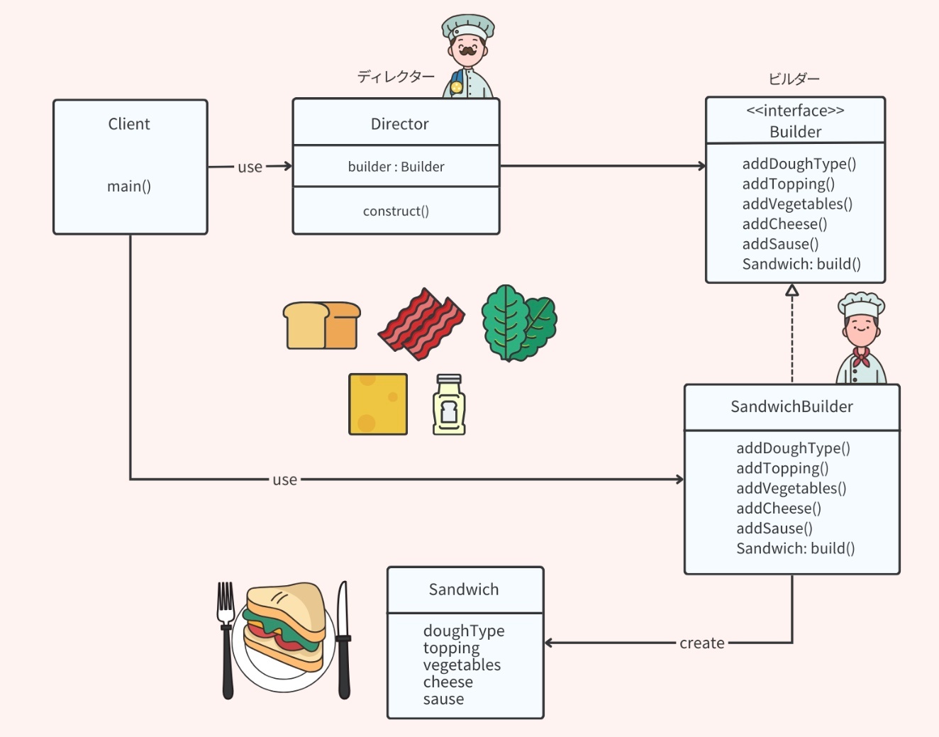 このパターンでは、リクエストと関連するパラメータをカプセル化した Command オブジェクトと、Command オブジェクトを呼び出してリクエストを実行する Invoker オブジェクトに分離される。