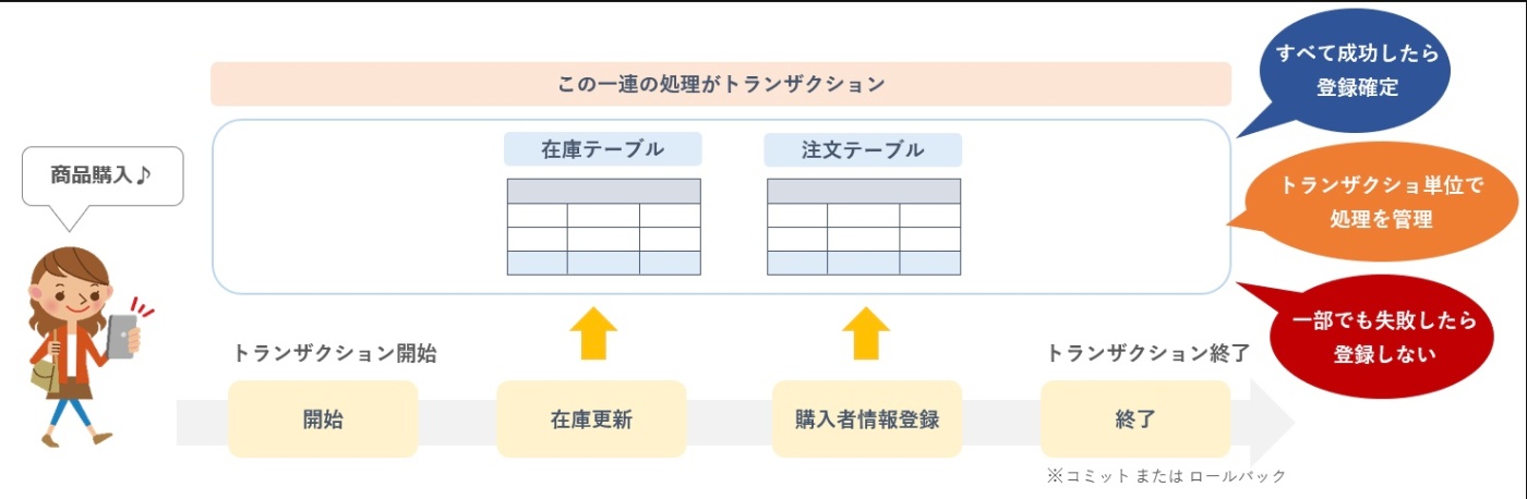 ※コミット:トランザクション内で行なわれた一連の変更をデータベースに永続的に反映させる操作。コミットが実行されると、それまでのデータの変更は確定され、他のトランザクションからも参照できるようになる。