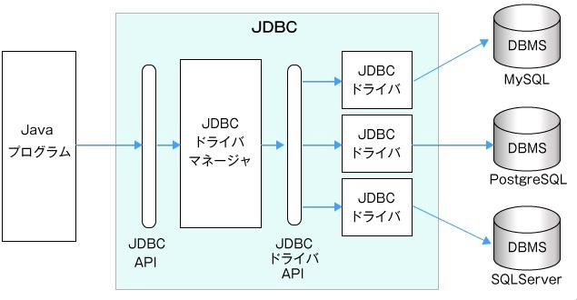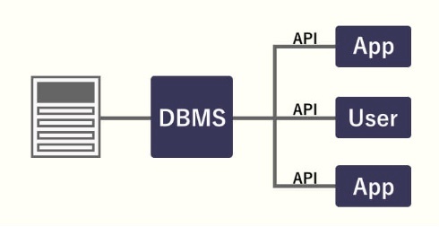 アプリケーション → API(インターフェース) → DBMS → データベース(実際のデータ)