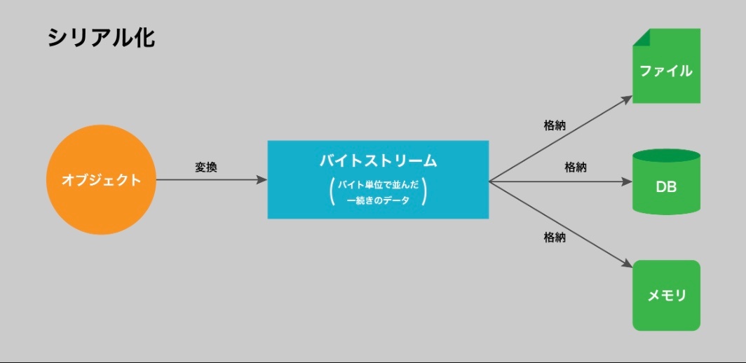→ オブジェクト(箱の中の複雑なデータ)を、一列に並べて文字列やバイト列に変換するイメージ