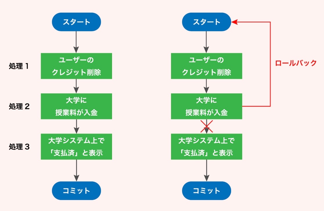 ※ロールバック:トランザクション内で行われた一連の変更をすべて取り消し、トランザクション開始前の状態に戻す操作。ロールバックは、トランザクションの途中でエラーが発生した場合や、意図しない変更が行なわれた場合に実行される。