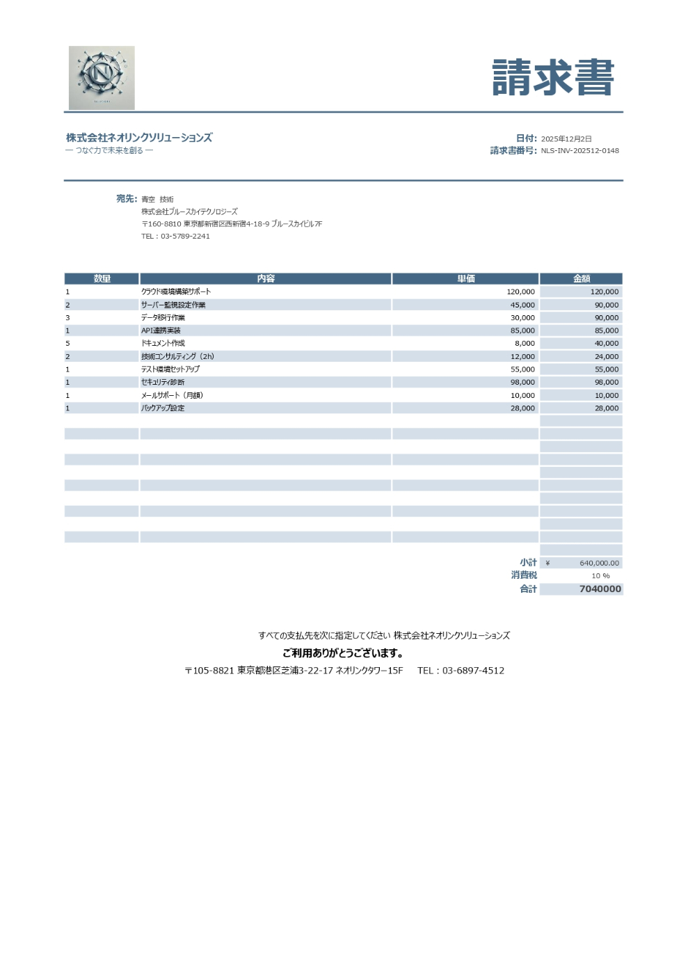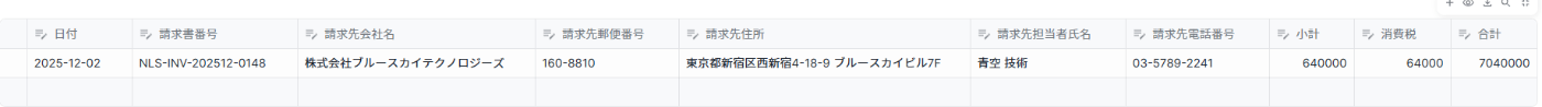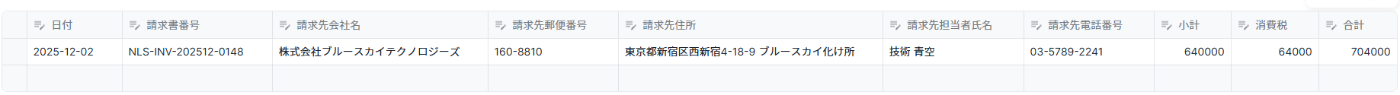 | 2025-12-02 | NLS-INV-202512-0148 | 株式会社ブルースカイテクノロジーズ | 160-8810 | 東京都新宿区西新宿4-18-9 ブルースカイビル7F | 青空 技術 | 03-5789-2241 | 640000 | 64000 | 7040000 |