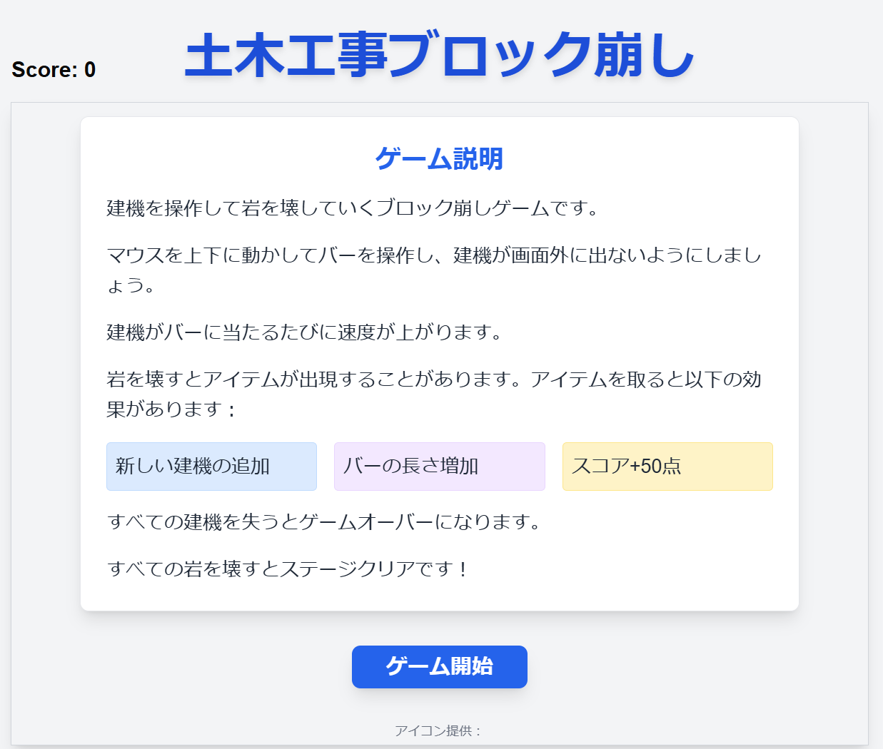 「ブロック崩しのUIを作って」「盛り土をブロックに」「バーの形状はバックホウのアームっぽく」