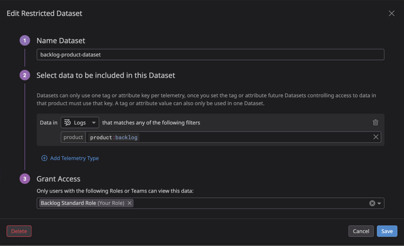 上記はヌーラボで設定している例です。Backlog に関わるテレメトリーデータへアクセス可能な Backlog Standard Role という Custom Role があります。この Role に割り当てる Restricted Dataset では、テレメトリータイプごとに product:backlog というタグを境界の条件として設定します。こうすることで、Backlog Standard Role を持つユーザーは Backlog に関連するログのみを閲覧できるようになります。また、product:backlog というタグを持つログは制限データとして扱われるため、Backlog Standard Role を持たないユーザーはこれらのデータにアクセスできません。