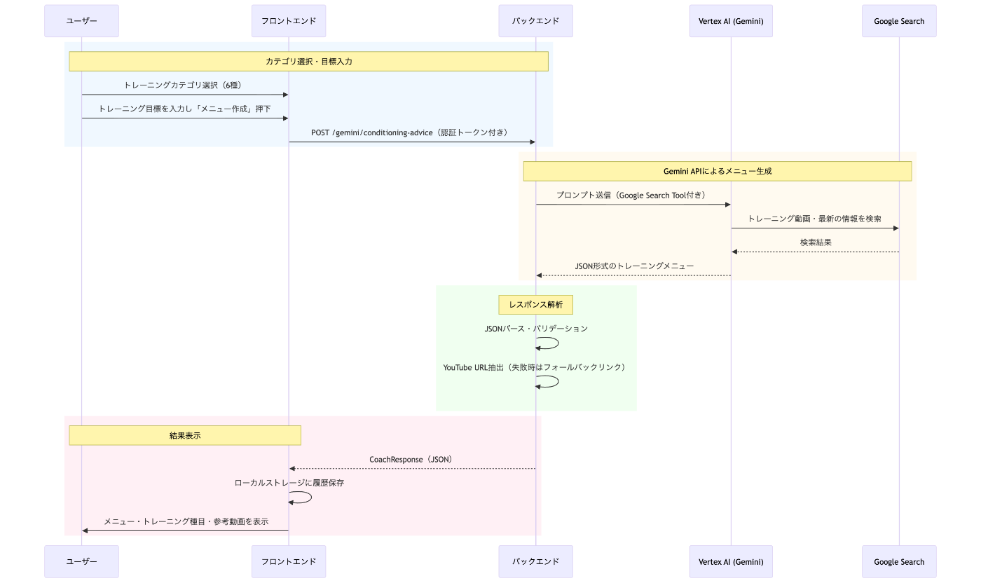 バックエンドではS&C(ストレングス&コンディショニング)コーチ専用のシステムプロンプトを構築し、Vertex AI (Gemini) に送信します。Google Search で最新のトレーニング動画を検索しながら、野球に特化したメニューを生成します。 -