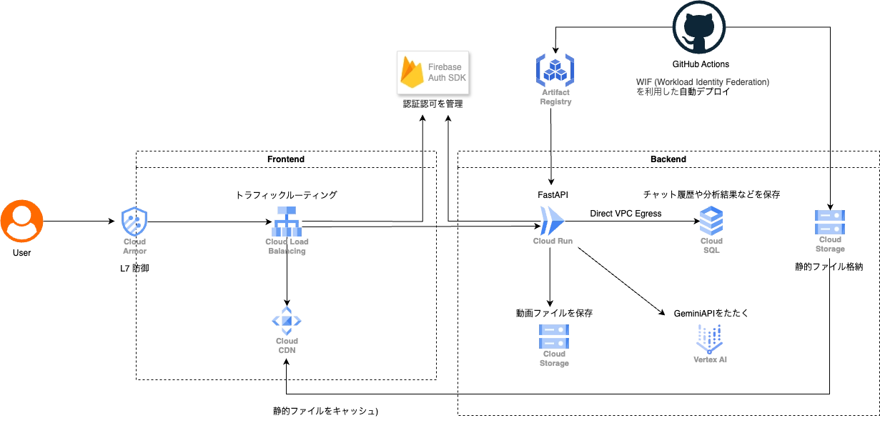 また、AI機能の中核となる部分では、Cloud Run から Vertex AI (Gemini API) を呼び出す構成としており、動画解析結果やチャット履歴などのデータは Cloud SQL と Cloud Storage に適切に振り分けて保存しています。