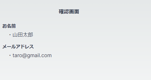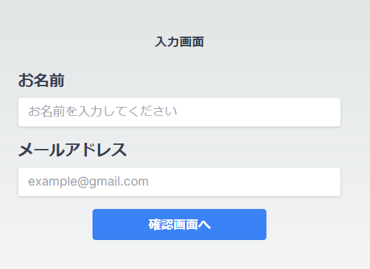 入力画面では、名前とメールアドレスの入力フォームを設けています。ユーザーがこれらの値を入力した後、handleSubmitを通じて確認画面への遷移が行われます。