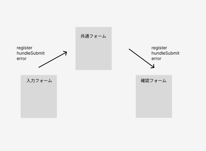 入力画面(子コンポーネント)からuseFormContextを通して、共通フォーム(親コンポーネント)で値を受け取り、確認画面(子コンポーネント)に値を渡します。