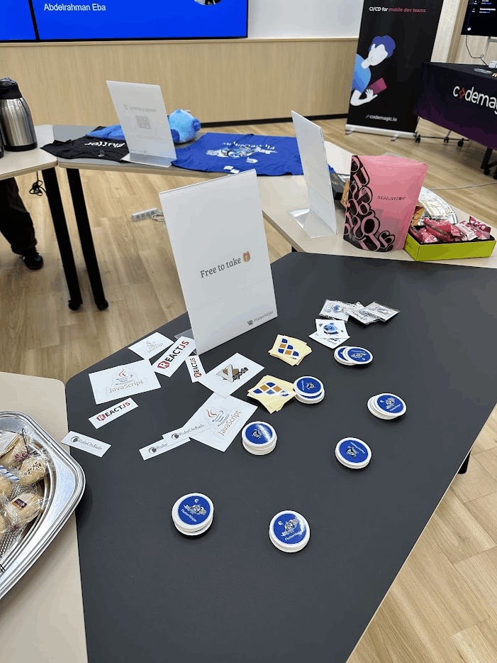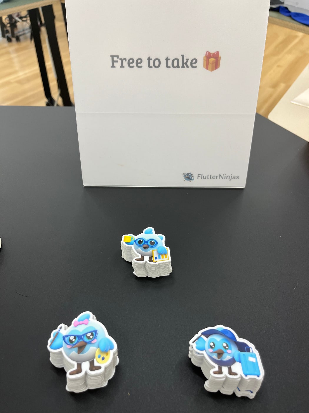 FlutterNinjasのステッカー(Q&Aで渡しているのとは別の通常版)やGoogleのFlutterチームから提供してもらったDashくんステッカーやピンバッジ、その他参加者の方が持って来てくれたステッカーなどを置いていました。