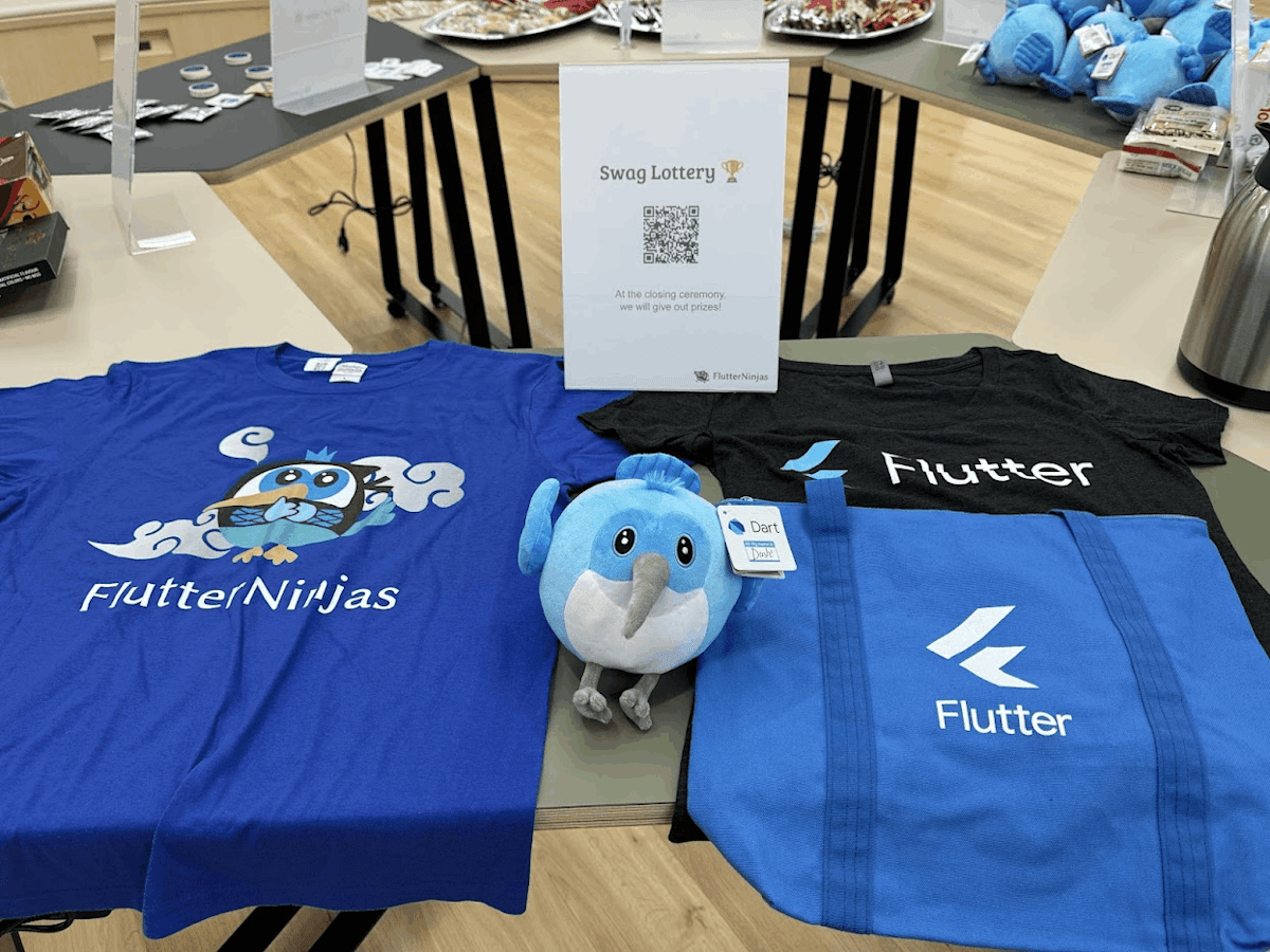 Flutterチームからの様々なグッズやFlutterNinjasのTシャツを設置。