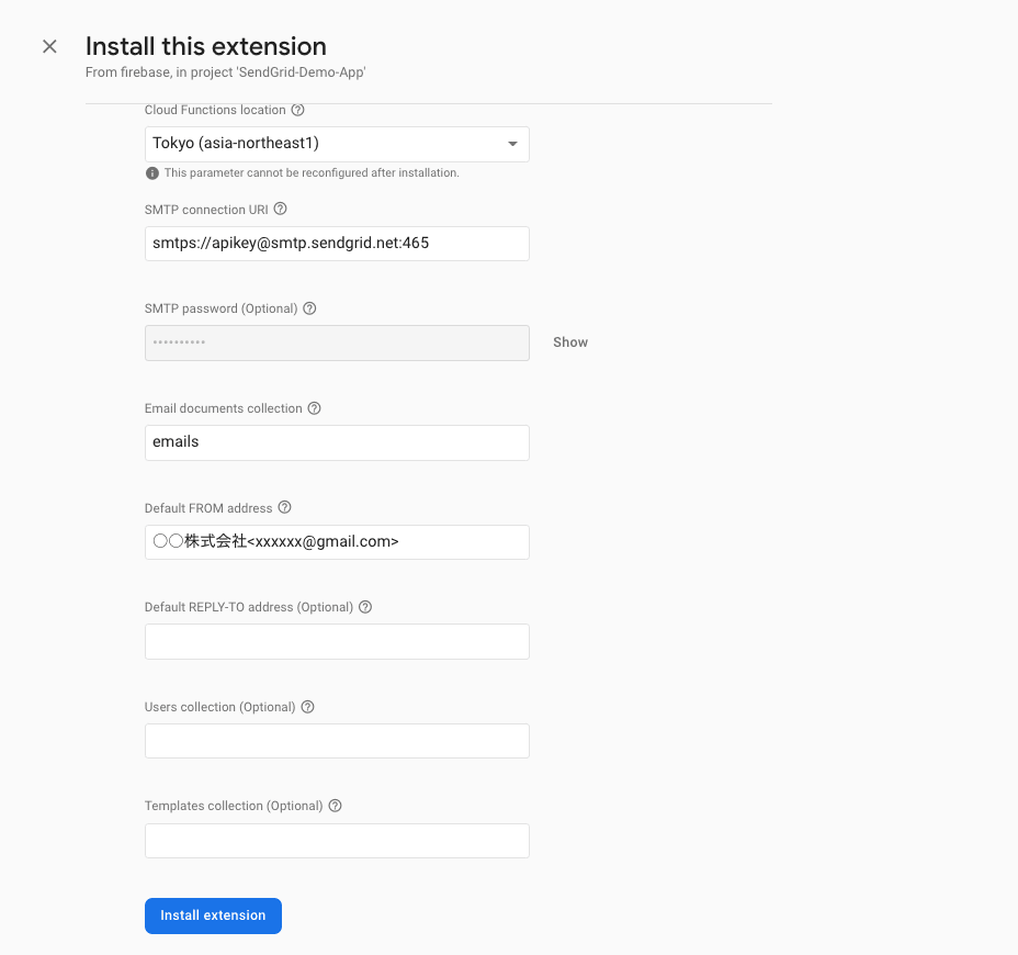Firebaseコンソールより「Trigger Email」という拡張機能を追加します。