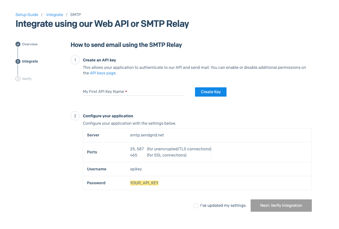 ユーザーページ左のメニュー欄から「Email API > Integration Guide > SMTP Relay」を選択して作成してください。