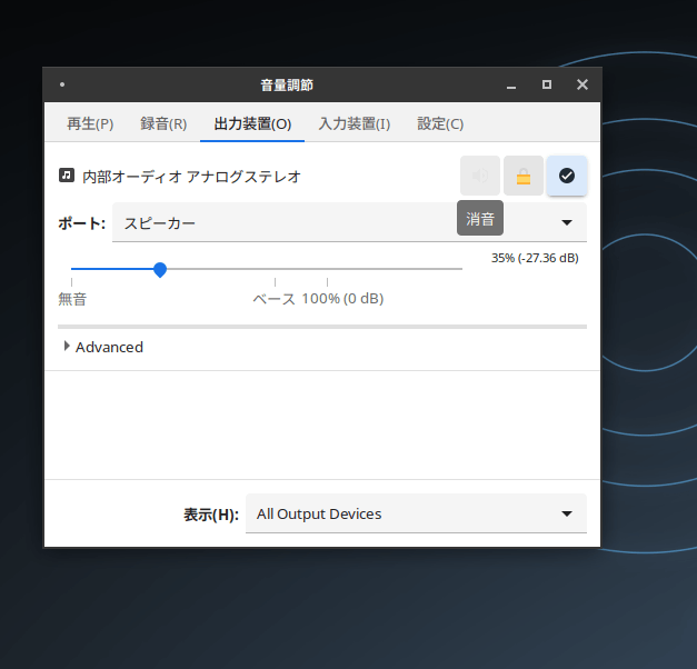でも、オーディオミキサーの画面で、スピーカーやマイクで、ミュートのボタンが表示されないのです。