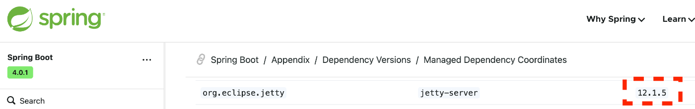 なぜこうなっているかと言うと、Spring Boot 4.0.1が管理しているJettyのバージョンが12.1.5だから。