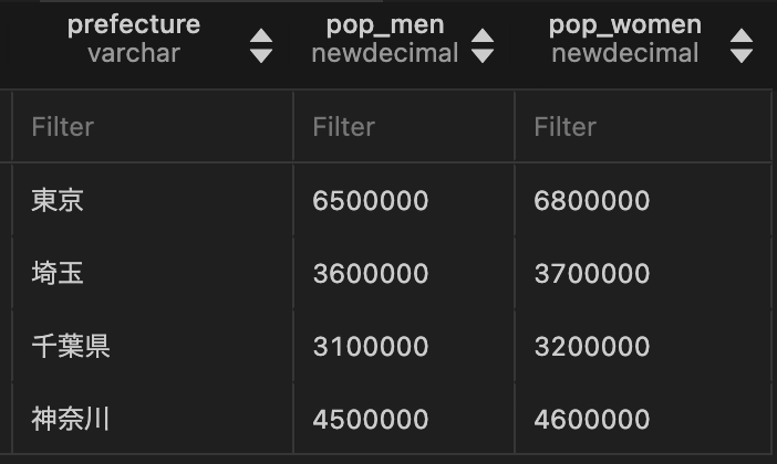 • 下記のようにダミーデータを作成して、都道府県別・男女別での合計人口を集計する
