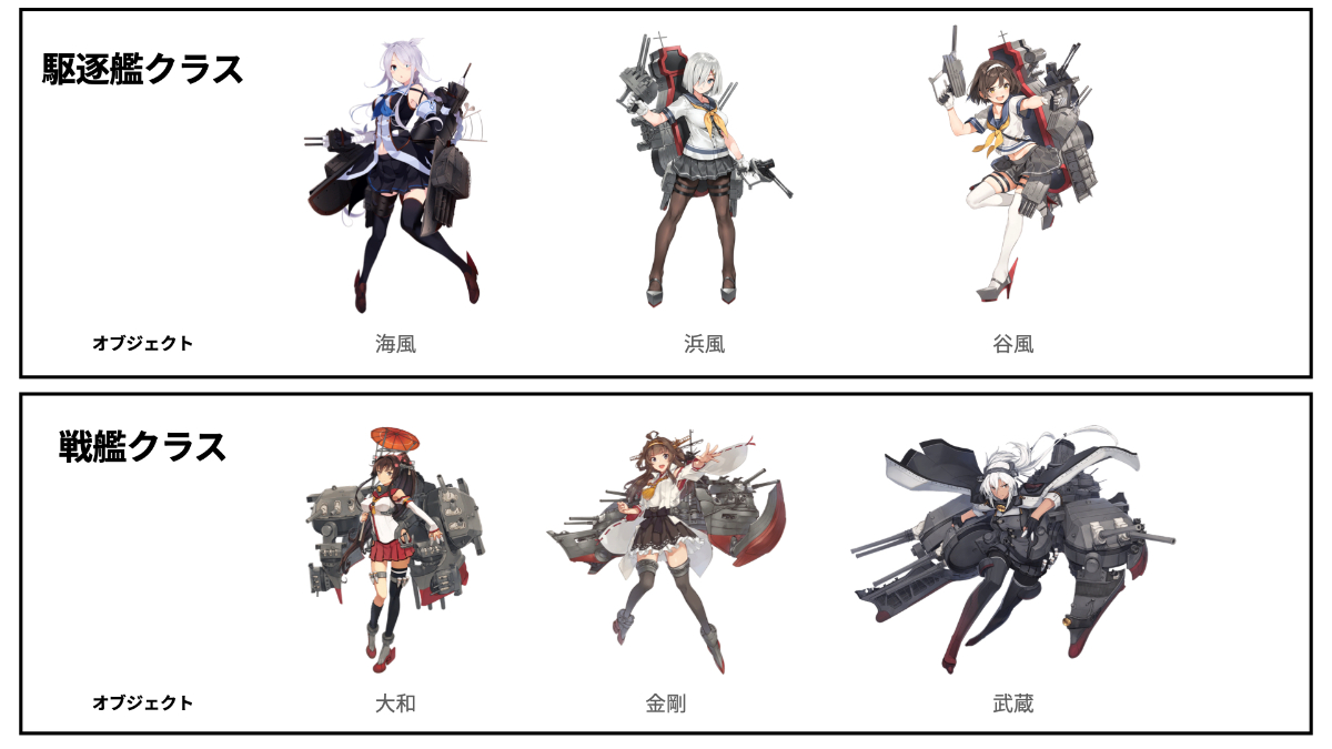 駆逐艦クラスに海風、浜風、谷風というオブジェクトがあり、戦艦クラスに大和、金剛、武蔵というオブジェクトがあります。