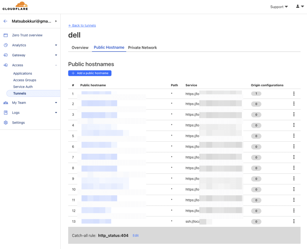 以下のように public のホスト名と、origin のサービス名を登録していきます。ここで登録すると Cloudflare の DNS の設定にレコードが追加されていきます。既存のレコードと重複する場合はエラーが出ます。