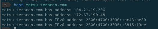 この blog.teraren.comのサイト自体もCloudflareを使っているのでDNSを引くとReverse proxy のアドレスが返ってきます。