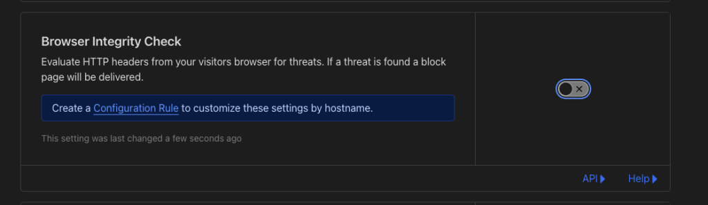 Security > Setting メニューに有る Browser Integrity Check はオフにしたほうが良さそうです。プログラムからアクセスされる API サービスを運用していると、このルールによって block されているリクエストが存在します。
