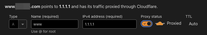 では、”Proxy status”を on にしたら左の項目に登録した IP アドレスはどう扱われるのかといいますと、リバースプロキシの origin のホストとして扱われます。