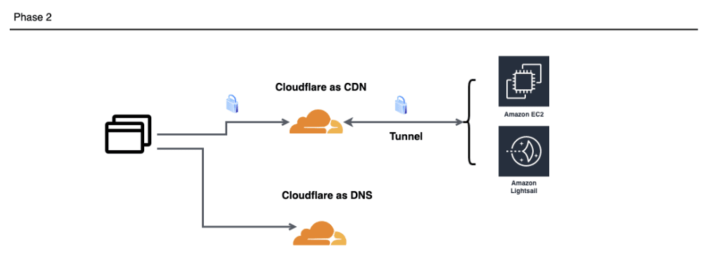 origin 側に Cloudflare の daemon を動かして、tunnel を設定できます。Cloudflare と origin の間のトラフィックをこの tunnel を通すことによってoriginサーバ側でポート開放をする必要が無くなります。