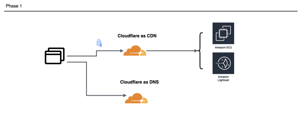 Cloudflare の DNS だけを使うだけでも無料で運用できるのでそれだけでも価値はあったりしますが、まずは Cloudflare の恩恵を受けるためには以下のような構成を作るのが 1 歩目です。
