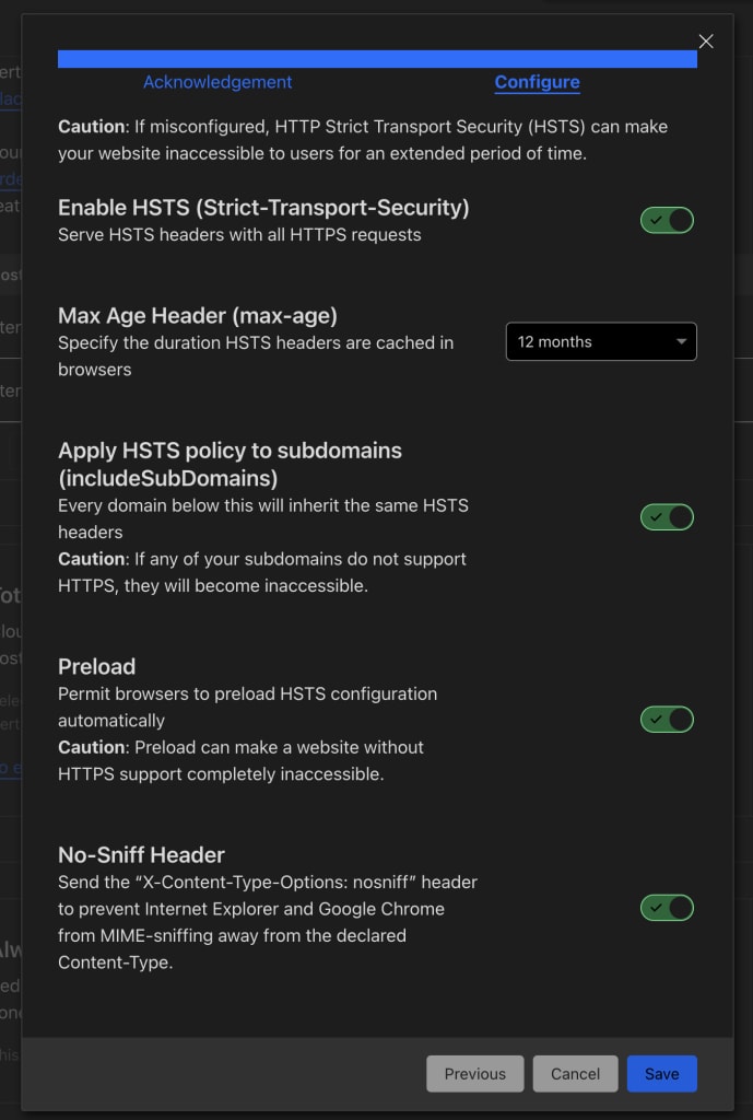 HSTSの設定項目。