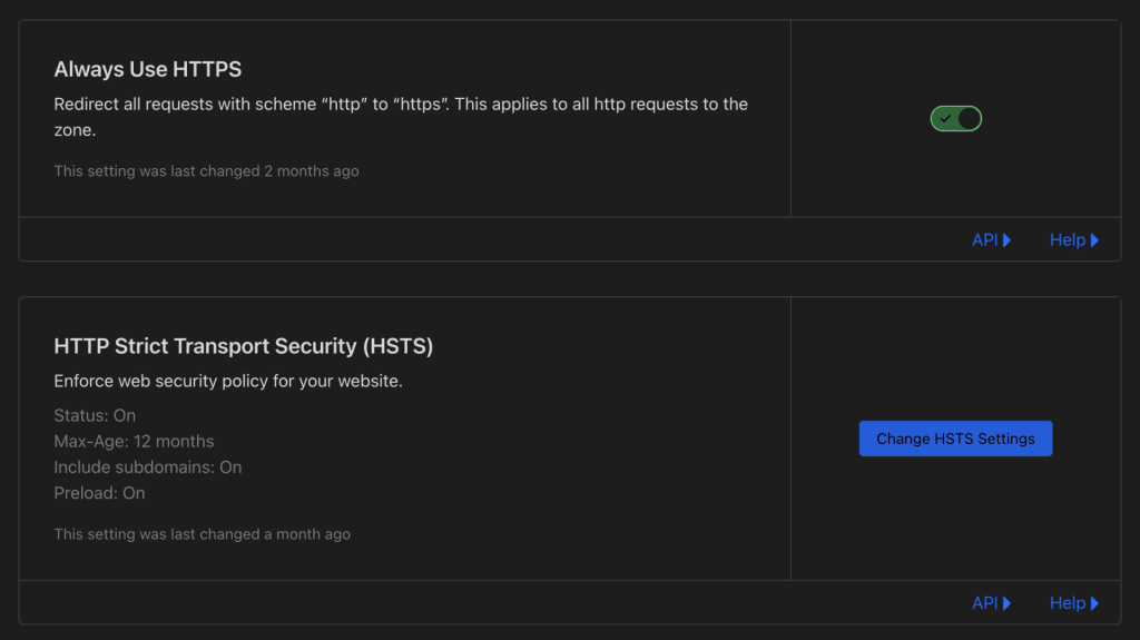 Cloudflare上で行うTLS証明書の設定関連では、HTTPからHTTPSのリダイレクト設定がスイッチ1つで行えたり、HSTSのヘッダ送信がUI上から行えます。