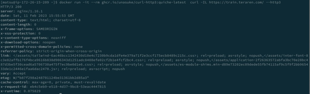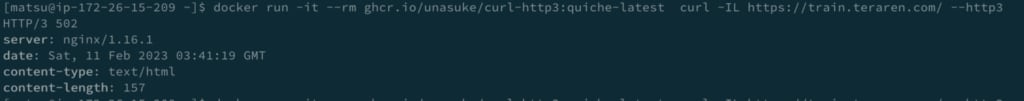 % docker run -it --rm ghcr.io/unasuke/curl-http3:quiche-latest curl -IL https://train.teraren.com/ --http3