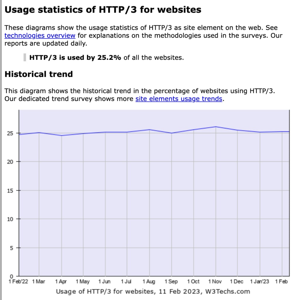 HTTP3 に対応したサイトが全世界の ウェブサイトの中で25%あるらしいです。