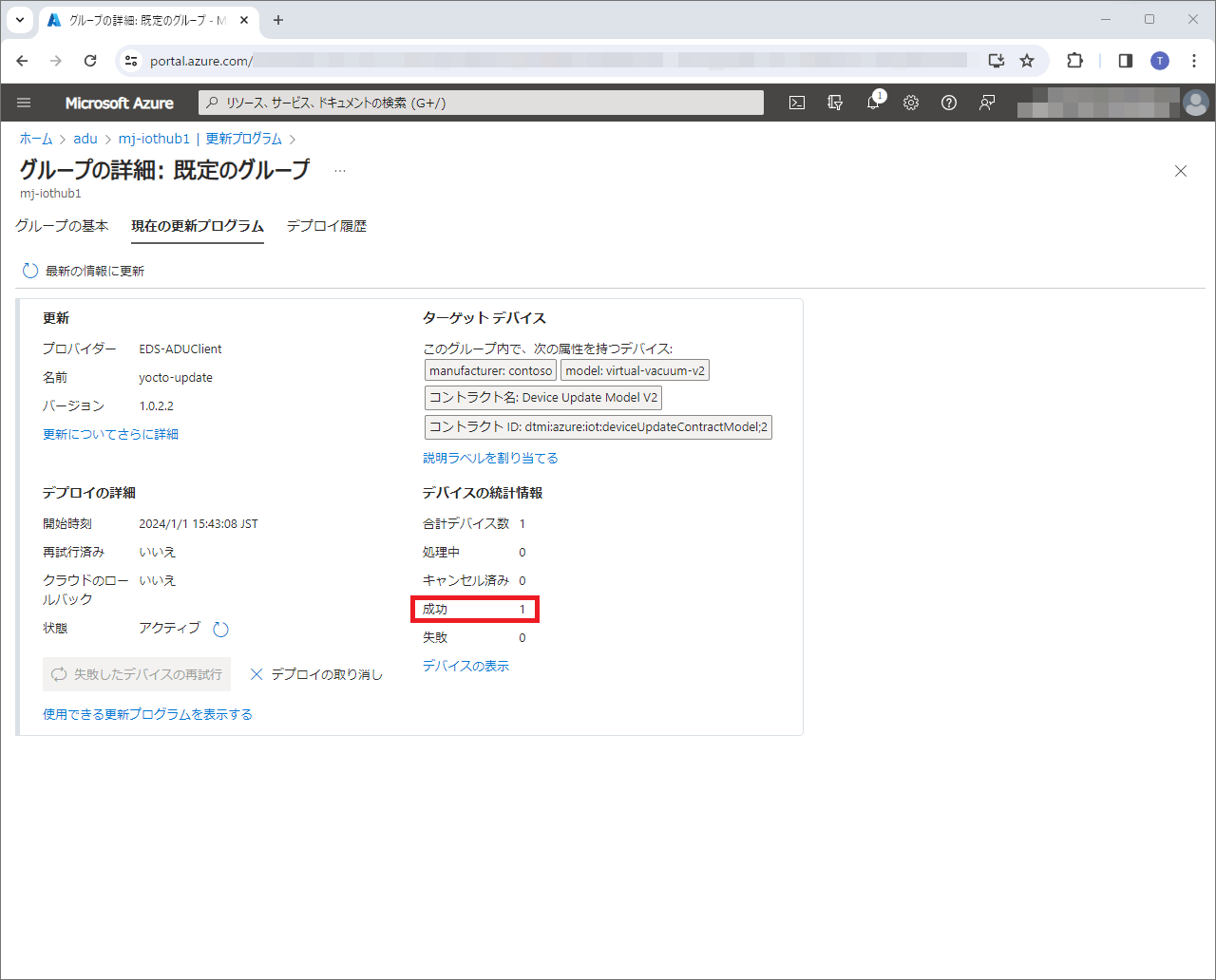Device Update AgentがAzure IoT Hubと接続、通信できると、Azure IoT Hubのデバイスのデバイスツインに、Device Update Agentの情報が書き込まれます。具体的には、properties.reported.deviceInformation.manufacturerにcontoso、properties.reported.deviceInformation.modelにvirtual-vacuum-v2と書かれていれば正常です。