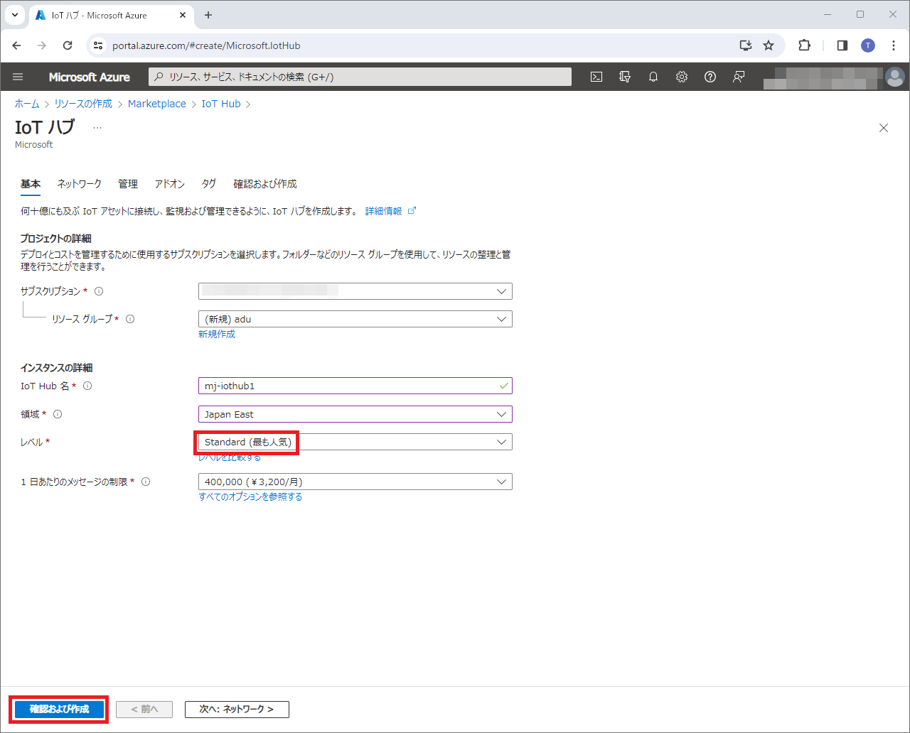 - レベル(Tier)はStandardにします。BasicはNG。Azure Device Update for IoT HubがStandardでしか使えない機能(デバイスツインなど)を利用するからです。[2]