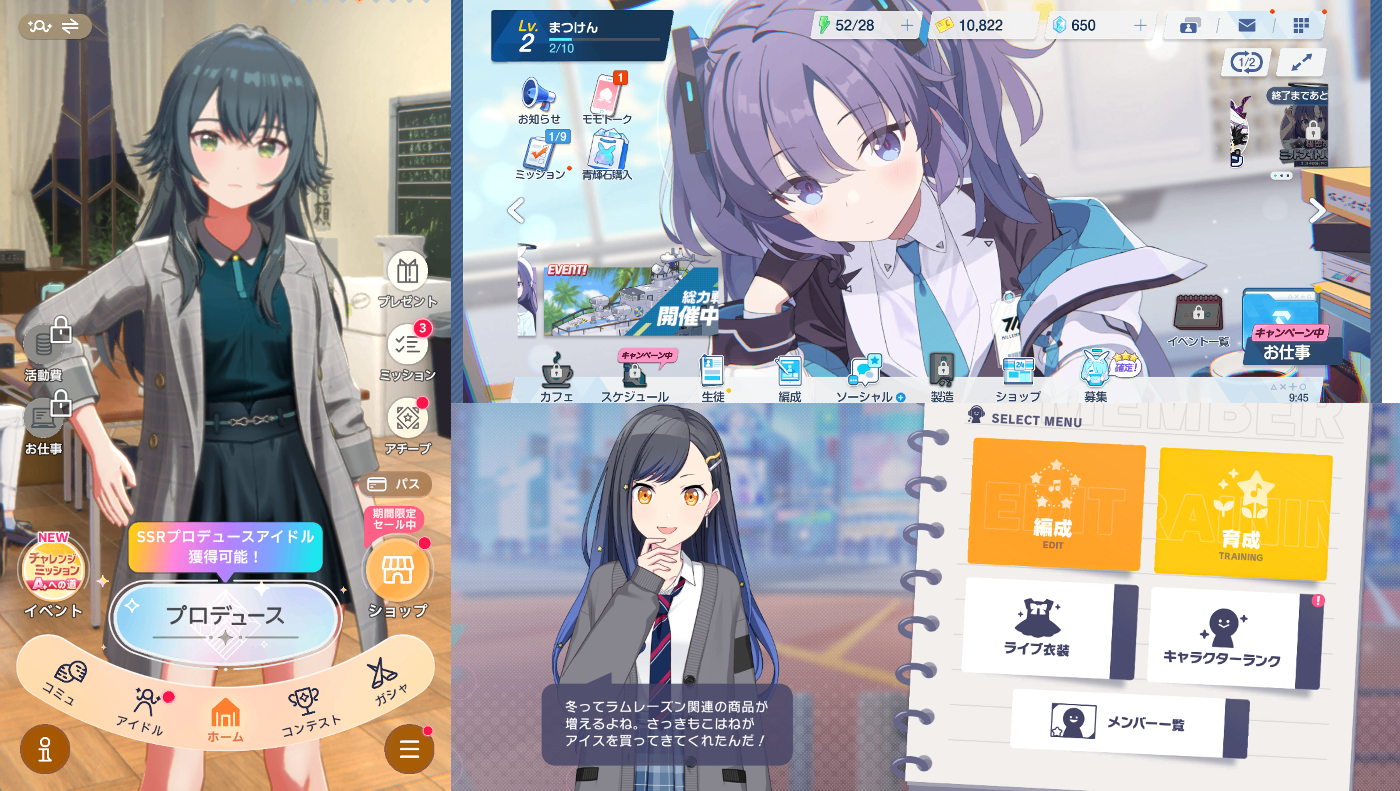 このHomeも曲者で、情報集約と遊び心を融合させることは難しかったです。ある日、スマホのゲームアプリのHomeに注目し、「ゲームキャラが話しかけてくれて、情報集約も行えるHomeあるやん!」とヒントを得ました!(プロセカ、学マス、FGO etc.)