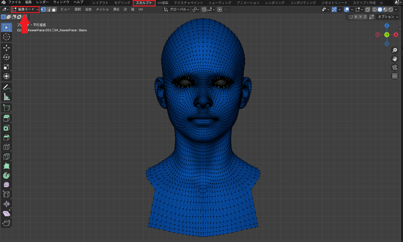 - 「オブジェクトモード」で目玉と歯以外のパーツを削除
