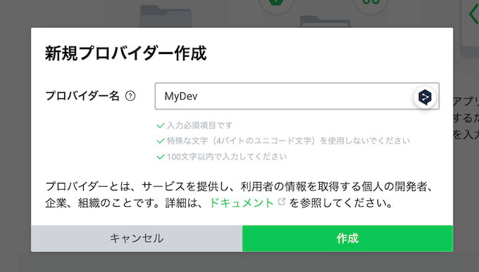 - コンソール(ホーム)画面で「新規プロバイダー作成」を押下し、適当なプロバイダー名を入力して作成する
