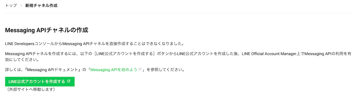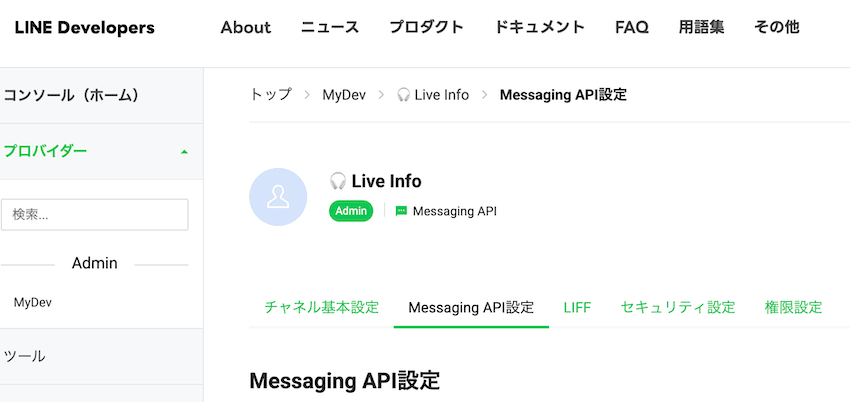 - LINE Developers 画面に戻り、作成したチャネルの「Messaging API 設定」タブを開く