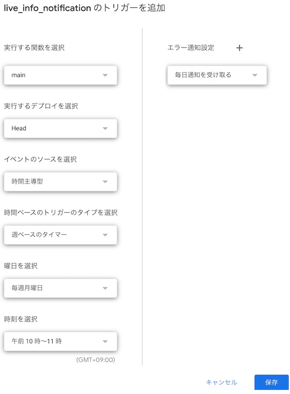 - 右下の「トリガーを追加」ボタンをクリックし、下記のように設定して保存する