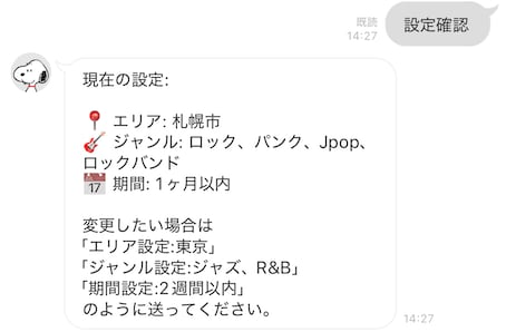 「設定確認」 とメッセージを送ると、現在の検索条件を確認できます。