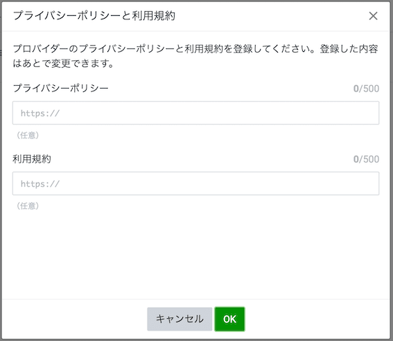 途中プライバシーポリシーの設定画面になりますが、ここは空で OK です