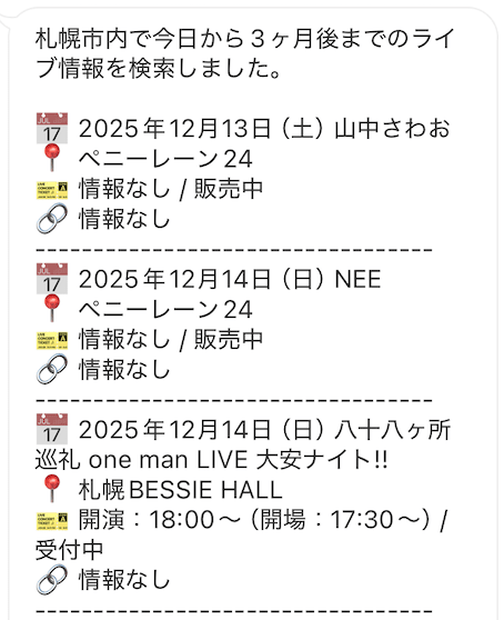 を自動で自分がよく見る媒体に通知してくれたら便利だし、ライブ開催後に「近くに来てたなら行きたかった(;^ω^)」と残念な気持ちになることも減らせるんでは?思ったので、LINE でお知らせする仕組みを作りました!